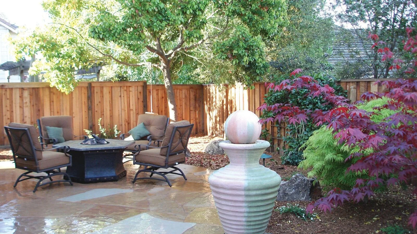 A backyard patio with outdoor furniture, including cushioned chairs and a stone fire pit table, surrounded by a wooden fence, lush green plants, and a decorative fountain.
